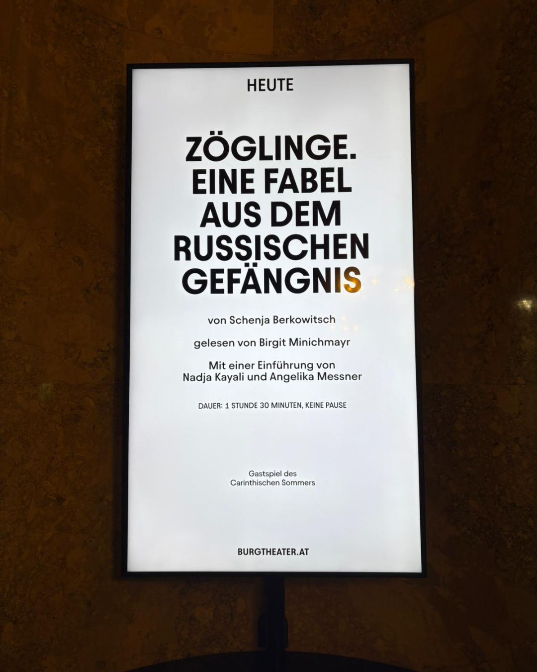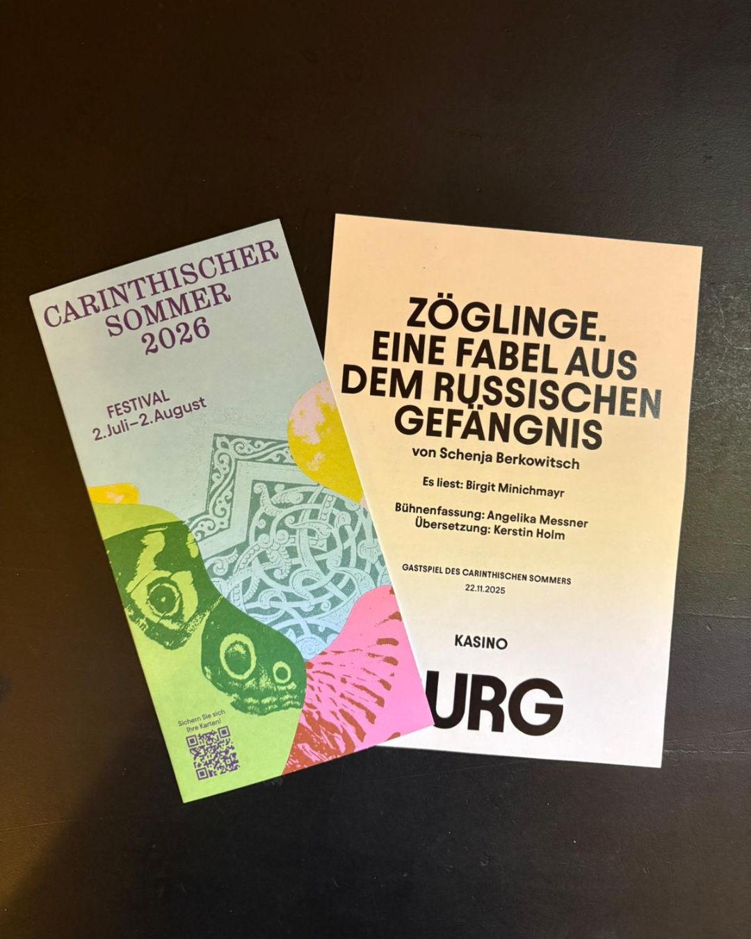Autorin Schenja Berkowitsch sitzt in Moskau im Frauengefängnis. Als Theaterschaffende zur Regimegegnerin degradiert, wartet sie – bisher vergebens – auf gerechte Behandlung und Freilassung. Das Buch Zöglinge hat sie für ihre halbwüchsigen Töchter im Gefängnis geschrieben. Eine Lesefassung des Manuskripts, das heimlich über die Grenze kam, wurde im Auftrag des Carinthischen Sommers übersetzt und im Rahmen des Festivals 2025 erstmals öffentlich vorgetragen.